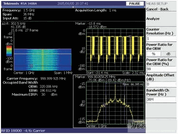 政府規(guī)定要求控制發(fā)射信號(hào)的功率、頻率、帶寬。這些規(guī)定防止有害干擾并保證每個(gè)發(fā)射者都是頻帶內(nèi)其他用戶的友好鄰居。對(duì)于許多頻譜分析儀特別是通常用于脈沖信號(hào)能量測(cè)量的掃頻頻譜分析儀,進(jìn)行此類測(cè)量是具有挑戰(zhàn)性的。RTSA 能夠分析一個(gè)完整的分組發(fā)射過(guò)程的能量特點(diǎn),也能直接測(cè)量跳頻信號(hào)的載波頻率,而無(wú)需將信號(hào)置于一個(gè)跨度的中心。按一下按鍵,分析儀就能識(shí)別一個(gè)瞬時(shí) RFID 信號(hào)的調(diào)制方式并能夠?qū)β?、頻率和帶寬進(jìn)行監(jiān)管測(cè)量,使預(yù)一致性(pre-compliance)測(cè)試過(guò)程變得非常靈活和方便 [參閱圖2]。預(yù)一致性測(cè)試有助于確保產(chǎn)品一次通過(guò)一致性測(cè)試,而無(wú)需重新設(shè)計(jì)和重新測(cè)試。