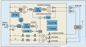 RF集成一個(gè)重要的發(fā)展出現(xiàn)在大約三年以前,當(dāng)時(shí)RF技術(shù)和數(shù)字基帶調(diào)制解調(diào)器的發(fā)展使得在無(wú)線手機(jī)中用直接下變頻接收器替代超外差射頻器件成為可能。超外差射頻器件使用多級(jí)混頻器、濾波器和多個(gè)電壓控制振蕩器(VCO),已經(jīng)很好地應(yīng)用了多年,但直接變頻射頻器件的集成度能夠大大減少GSM RF總體元件數(shù)。在上世紀(jì)九十年代后期,一個(gè)典型的單頻段超外差RF子系統(tǒng)包括PA、天線開關(guān)、LDO、小信號(hào)RF和VCTCXO,需要大約200個(gè)分立器件;今天,我們能夠設(shè)計(jì)一個(gè)具有四頻段功能的直接變頻系統(tǒng),集成了VCO、VCXO和PLL回路濾波器,而它的元件數(shù)卻少于50個(gè)。