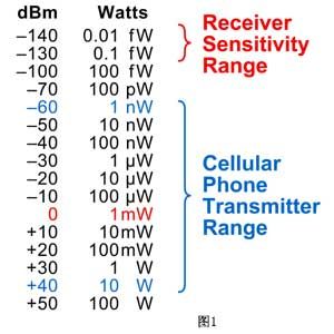 分貝dB是一個(gè)相對(duì)的值。另一個(gè)相關(guān)的單位是毫瓦分貝dBm,它是相對(duì)于1mW的絕對(duì)功率。圖1給出了dBm的值及其相應(yīng)的瓦特?cái)?shù),其中還給出了移動(dòng)電話的發(fā)射機(jī)發(fā)射功率參考范圍,以及靈敏接收機(jī)所能檢測(cè)到的最低信號(hào)功率。圖2給出的等式定義了室溫下射頻信號(hào)的理論熱噪聲。由于射頻信號(hào)通過(guò)空氣的傳輸以及受到大氣干擾和其它信號(hào)的干擾,到達(dá)接收機(jī)端的信號(hào)電平可能變得非常低。接收機(jī)常常需要檢測(cè)低于0.1pW的信號(hào)(或者低于微伏的信號(hào)電平)。