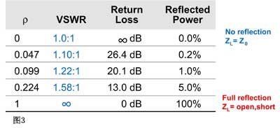如果某個(gè)信號(hào)波從一種特征阻抗傳輸?shù)搅硪环N不同的特征阻抗,那么就會(huì)引起信號(hào)反射和反向傳輸。如果阻抗相同,就不會(huì)發(fā)生反射。當(dāng)由于阻抗不連續(xù)而發(fā)生信號(hào)發(fā)射時(shí),就會(huì)在傳輸線的兩個(gè)方向上出現(xiàn)信號(hào)波的傳輸。在這兩個(gè)波相位相同的點(diǎn)上,將出現(xiàn)最大的電壓幅值Vmax;在它們相位相差180度的點(diǎn)上,將出現(xiàn) Vmin。Vmax和Vmin的比值稱為電壓駐波比,即VSWR。VSWR是衡量某個(gè)連接器或某條線纜的阻抗是否接近50歐姆的一個(gè)指標(biāo)。圖3給出了理想情況下全匹配(沒(méi)有反射)、理想開(kāi)路(100%反射),以及極端情況下這三個(gè)值之間的關(guān)系。
