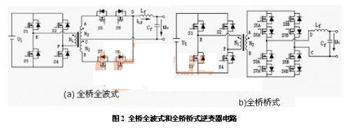 根據(jù)高頻逆變器(推挽式、半橋式、全橋式)、周波變換器(全波式、橋式)的組合不同,高頻脈沖交流環(huán)節(jié)逆變器具有6種電路拓撲,其中全橋全波式、全橋橋式電路如圖2所示。