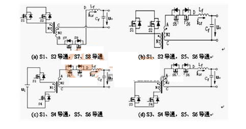 讓周波變換器的功率開關(guān)S5與S7(S6與S8)之間存在換流重疊導通時間、S5與S6(S7與S8)按濾波電感電流iLf極性選擇導通,從而使得該控制方案具有如下優(yōu)點:1、周波變換器換流重疊期間實現(xiàn)了變壓器漏感能量的自然換流,實現(xiàn)了功率器件的零電流開關(guān);2、實現(xiàn)了濾波電感電流的自然續(xù)流;3、iLf極性選擇信號的引入避免了換流重疊期間周波變換器中的環(huán)流現(xiàn)象;4、每個開關(guān)周期內(nèi)兩次交流側(cè)的能量回饋實現(xiàn)了逆變橋所有功率器件的零電壓開通[5]。