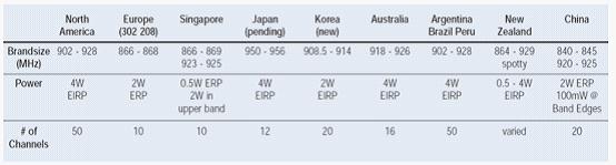 圖2:EPC Class1 G2的900MHz UHF 頻段范圍在各國(guó)的分配情況不一。