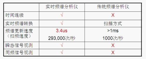 圖3: 實(shí)時(shí)頻譜分析儀和傳統(tǒng)頻譜分析儀的區(qū)別。