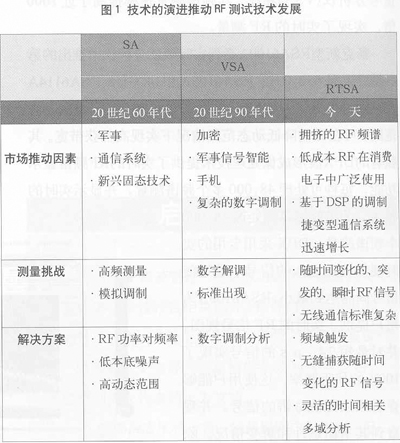 19世紀(jì)60年代,James Maxwell 通過(guò)計(jì)算推斷出存在著能夠通過(guò)真空傳輸能量的電磁波。此后工程師和科學(xué)家們一直在尋求創(chuàng)新方法利用無(wú)線電技術(shù)。接下來(lái),隨著軍事和通信領(lǐng)域技術(shù)的深入發(fā)展,20世紀(jì)無(wú)線電技術(shù)一直在不斷創(chuàng)新,技術(shù)的演進(jìn)也推動(dòng)著RF測(cè)試技術(shù)向前發(fā)展(見圖1)。從軍用的跳頻電臺(tái)、雷達(dá)到RFID,第三代移動(dòng)通信、藍(lán)牙、WLAN,各種微功率發(fā)射裝置等,瞬態(tài)信號(hào)如今無(wú)處不在。瞬態(tài)信號(hào)存在的普遍性使得技術(shù)人員需要有效的儀器對(duì)其進(jìn)行捕獲、存儲(chǔ)并回放分析。另外,監(jiān)測(cè)間歇性干擾或頻譜使用情況等也需要一種有效的手段來(lái)實(shí)現(xiàn)“寬帶實(shí)時(shí)監(jiān)測(cè)”。