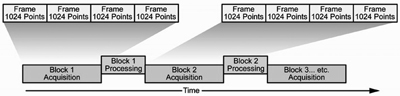 圖5是塊采集模式,可以實(shí)現(xiàn)實(shí)時(shí)無(wú)縫捕獲。對(duì)塊內(nèi)部的所有幀,每個(gè)采集在時(shí)間上都是無(wú)縫的。在一個(gè)采集塊中的信號(hào)處理完成后,將開始采集下一個(gè)塊。塊存儲(chǔ)在內(nèi)存中,可以應(yīng)用任何實(shí)時(shí)測(cè)量。例如,實(shí)時(shí)頻譜模式下捕獲的信號(hào)可以在解調(diào)模式和時(shí)間模式下分析。