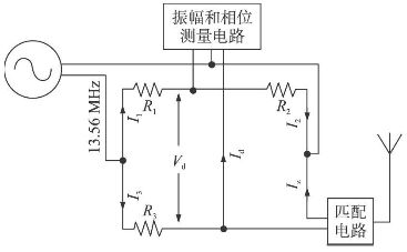 (1)測(cè)量電橋 用來(lái)測(cè)試天線的反射系數(shù)。主體部分為惠斯通電路,如圖4所示。其電路中的直流電源用波形產(chǎn)生器替代,用來(lái)生成13. 56 MHz的正弦載波信號(hào)。其中電阻R1、R2、R3 都為50 Ω。