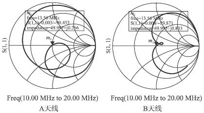 手動(dòng)調(diào)諧即是交替不斷調(diào)整電容C1、C2 的值,同時(shí)觀察曲線變化,直到在所要求的頻率點(diǎn)S11等于0。圖2為某一天線電路在頻率在10~20MHz之間變化時(shí),其反射系數(shù)的變化曲線,其中,標(biāo)記13. 56MHz的點(diǎn), S11值近似為0,達(dá)到了匹配要求。