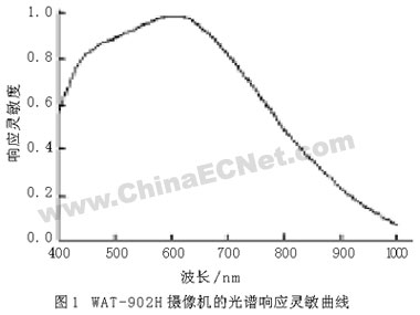獲得的圖像質(zhì)量直接影響圖像處理程序的復(fù)雜度和檢測結(jié)果。如果采用的光源單色性越好,越接近平行光,則圖片的干涉條紋更清晰,質(zhì)量更好。然而單色激光器或者平行光源體積大,而紅外測試系統(tǒng)的一大特點(diǎn)就是結(jié)構(gòu)簡單、緊湊,而提供窄波段的照明價(jià)格比較昂貴,且不易控制,因此選用普通的白熾燈作為光源。為了得到較好的紅外圖片,在鏡頭的上方放置一塊雙面鏡面拋光的硅片,從而過濾掉可見光對圖片的影響。同時,選用超低照度黑白攝像機(jī)WAT-902H,它的光譜響應(yīng)靈敏曲線如圖1所示。而紅外線波長為750 nm~1000μm,這樣我們采用普通的光源就可以獲得窄波段的紅外圖像。另外,由于該相機(jī)對紅外波段的響應(yīng)靈敏度不高,可以通過增加光強(qiáng)來克服,從而獲得清晰的紅外干涉圖像,為后續(xù)的圖像分析和處理做準(zhǔn)備。