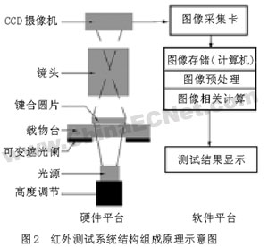 光源通過可變光闌照射到鍵合片,光線透過鍵合片,通過鏡頭,在攝像機(jī)上成像,從而獲得鍵合片的紅外圖像,通過數(shù)據(jù)采集卡送入計(jì)算機(jī),經(jīng)過圖像處理程序的處理,顯示測試結(jié)果。