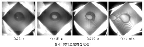 將紅外檢測應(yīng)用到鍵合裝置中,可以實(shí)時監(jiān)控鍵合過程。圖4(a)~(d)是截取的預(yù)鍵合過程中的4幅圖片,可以清晰地觀察鍵合波從中間向四周擴(kuò)張的傳播過程。圖中所標(biāo)的數(shù)字表示預(yù)鍵合時間(晶片經(jīng)活化處理后,從兩晶片開始接觸到逐步鍵合所經(jīng)歷的時間)。1 min后,鍵合面積基本不再發(fā)生變化,預(yù)鍵合結(jié)果如圖4(d)所示。