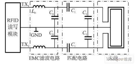 (1)電磁兼容( EMC)濾波(L0 , C0 )電路;(2)包含可調(diào)諧電容C1、C2 的匹配電路;(3)天線(xiàn)。
