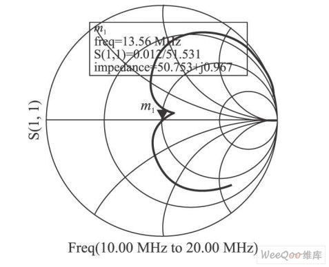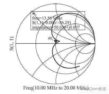 手動(dòng)調(diào)諧即是交替不斷調(diào)整電容C1、C2 的值,同時(shí)觀(guān)察曲線(xiàn)變化,直到在所要求的頻率點(diǎn)S11等于0。圖2為某一天線(xiàn)電路在頻率在10~20MHz之間變化時(shí),其反射系數(shù)的變化曲線(xiàn),其中,標(biāo)記13. 56MHz的點(diǎn), S11值近似為0,達(dá)到了匹配要求。