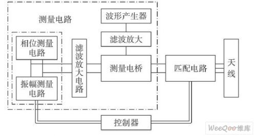 手工匹配采用的是阻抗分析儀或者網(wǎng)絡(luò)分析儀,網(wǎng)絡(luò)分析儀是用定向耦合器來(lái)測(cè)量天線(xiàn)電路的反射系數(shù)。但使用定向耦合器有幾個(gè)主要的缺點(diǎn),例如功率損耗大和很難嵌入到IC芯片。故而本文在電路中不使用耦合器,從圖3看出,測(cè)量電路包含以下4部分。