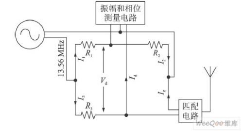 (1)測(cè)量電橋 用來(lái)測(cè)試天線(xiàn)的反射系數(shù)。主體部分為惠斯通電路,如圖4所示。其電路中的直流電源用波形產(chǎn)生器替代,用來(lái)生成13. 56 MHz的正弦載波信號(hào)。其中電阻R1、R2、R3 都為50 Ω。