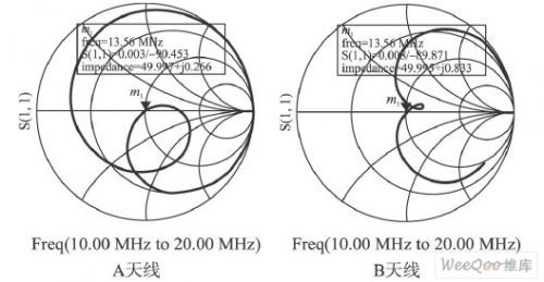 結(jié)果如圖7所示,對(duì)于A(yíng), B兩種天線(xiàn)的任何一種,都找到了最優(yōu)C1 和C2 的組合。當(dāng)頻率為13. 56MHz時(shí),兩類(lèi)天線(xiàn)的反射系數(shù)雖然與0點(diǎn)都有一定的偏差,但其偏差都在可接受范圍之內(nèi)。