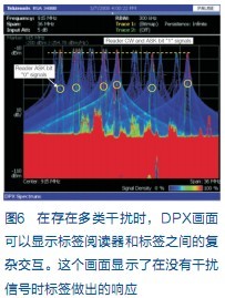 在進(jìn)行頻率規(guī)劃,把每個(gè)閱讀器限定在某條通道(或多條通道)時(shí),可以使用DPX保證調(diào)制邊帶的電平不會(huì)在并放閱讀器使用的通道中產(chǎn)生干擾。注意圖6中心的閱讀器和標(biāo)簽信號(hào)擁有寬頻譜展寬,駐留時(shí)間要長(zhǎng)于其它通道。較亮的信號(hào)邊緣表明信號(hào)密度較高,因此駐留時(shí)間較長(zhǎng)。這可能會(huì)導(dǎo)致鄰道讀取失敗,應(yīng)采取措施,保證閱讀器中的濾波功能足以抗擊這種干擾。