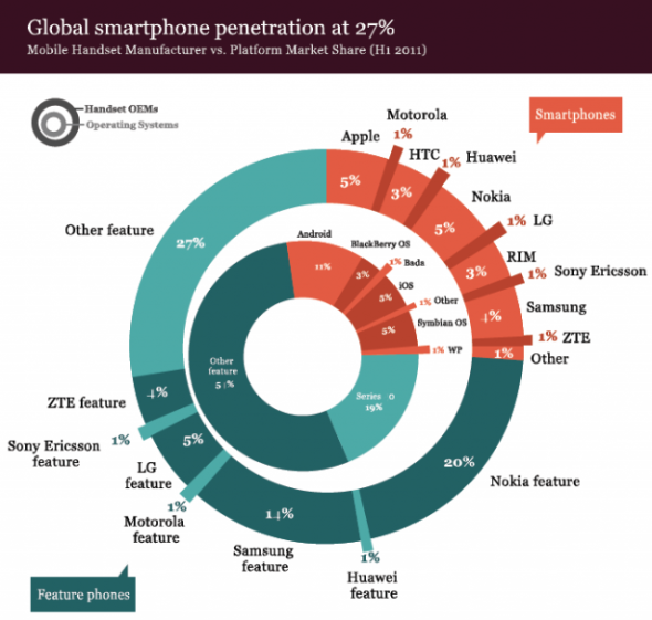 就智能手機市場領導者而言,當前的競爭是在iPhone和Android之間展開的,原因是前手機行業(yè)領導者諾基亞對iPhone的出現(xiàn)反應遲緩,因此在高端智能手機市場上所占份額正在穩(wěn)步下滑。諾基亞已決定從Symbian系統(tǒng)轉向Windows Phone系統(tǒng),這一決定不僅令三星、HTC、摩托羅拉、LG和索尼等Android廠商獲得優(yōu)勢,同時也令華為、中興、宏碁、戴爾和華碩等后來者受益。