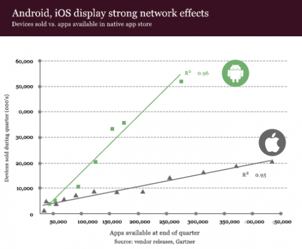 一件有趣的事情是,從手機應用這方面來看,所有排名靠前的智能手機廠商的網(wǎng)絡效應都能表明其產品的受歡迎度。以上圖表顯示的是某一特定時間點在某一特定平臺上的應用數(shù)量,以及這一時間點以前的一個季度中該平臺的手機出貨量數(shù)據(jù)。由此得出的圖表證明Android和iOS備受歡迎,同時也表明對于另一個競爭對手來說,想要成為第三大平臺有多么困難。