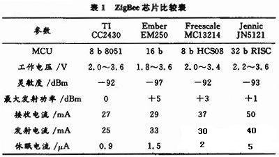 ZigBee技術(shù)是一種近距離、低功耗、低數(shù)據(jù)速率、低復(fù)雜度的雙向無線通信技術(shù),適用于無線傳感器網(wǎng)絡(luò)。目前,多家公司均有自己的主流ZigBee芯片,如表1所示。經(jīng)綜合比較,該設(shè)計選用CC2430芯片,該芯片是Chipcon公司提供的全球首款支持ZigBee協(xié)議的SoC解決方案,它在單個芯片上整合了ZigBee射頻前端、內(nèi)存和微控制器,最大27 mA的工作流耗及在休眠模式下0.9μA的流耗使之非常適合無線傳感節(jié)點(diǎn)對低功耗的要求。