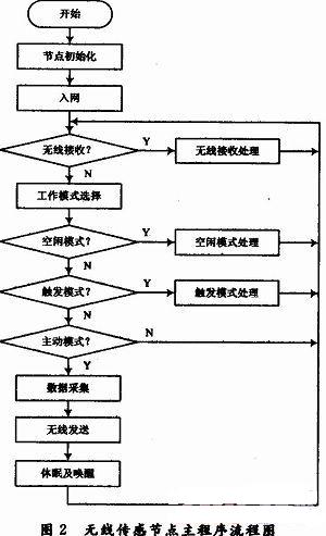 節(jié)點(diǎn)程序主流程如圖2所示,主要包括數(shù)據(jù)采集和無線通信兩個部分。出于傳感節(jié)點(diǎn)低功耗的考慮,軟件設(shè)計重點(diǎn)放在工作模式的處理上。