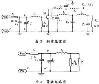 下面僅說明測(cè)量射頻功率管2SC1971的輸入阻抗的具體過程,輸出阻抗的測(cè)量方法與此相似。圖3是測(cè)量2SC1971的輸入阻抗的原理圖,圖4是他的等效電路圖。R1的值設(shè)計(jì)為10 Ω左右,以減少輸入的功率,同時(shí)HA由R1組成比較簡(jiǎn)單,便于計(jì)算,HB由L1,C1,R2組成,同時(shí)也是功率管的匹配和偏置網(wǎng)絡(luò)。HA,HB也可以由多級(jí)L型或Ⅱ型雙口網(wǎng)絡(luò)組成,只是計(jì)算量增大。經(jīng)過實(shí)測(cè)采用單級(jí)L型網(wǎng)絡(luò)在bb′處測(cè)得的波形比較接近正弦波,測(cè)量出的結(jié)果誤差不大。