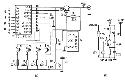 該部分電路主要由315MHz無線數(shù)據(jù)發(fā)射模塊和編碼集成PT2262組成。該無線發(fā)射模塊原理圖如圖1中(b)所示,它具有較寬的工作電壓范圍3-12V,當(dāng)電壓變化時(shí)發(fā)射頻率基本不變,和發(fā)射模塊配套的接收模塊無需任何調(diào)整就能穩(wěn)定地接收。當(dāng)發(fā)射電壓為3V時(shí),空曠地傳輸距離約20-50m,發(fā)射功率較?。划?dāng)電壓5V時(shí)約100-200m)當(dāng)電壓9V時(shí)約300-500m;當(dāng)發(fā)射電壓為12V時(shí),為最佳工作電壓,具有較好的發(fā)射效果,發(fā)射電流約60毫安,空曠地傳輸距離700-800m,發(fā)射功率約500mW.當(dāng)電壓大于12V時(shí)功耗增大,有效發(fā)射功率不再明顯提高。發(fā)射模塊采用ASK方式調(diào)制,以降低功耗。當(dāng)數(shù)據(jù)信號停止時(shí)發(fā)射電流降為零,數(shù)據(jù)信號與DF發(fā)射模塊輸入端可以用電阻或者直接連接而不能用電容耦合,否則DF發(fā)射模塊將不能正常工作。數(shù)據(jù)電平應(yīng)接近DF數(shù)據(jù)模塊的實(shí)際工作電壓,以獲得較高的調(diào)制效果。