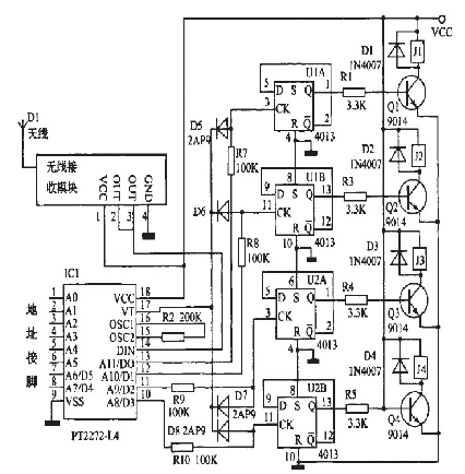 所以輸出接口在未解碼時(shí)就為低電平輸出了,即為非鏤狀態(tài)。所以如果將蠶2(a)中酶PT2272--M4改為Pr2272~L4,相應(yīng)的將原理網(wǎng)圖2(a)改為圖3,也能實(shí)現(xiàn)同樣的功能,即四路非鎖狀態(tài)。如果將某一路改為蠢錟狀態(tài),將耀應(yīng)的二極管去掉幫霹。鍘如,去掉D5,就將PT2272--L4的第13腳的非自鎖定輸出改為錟定輸出。