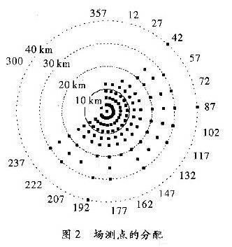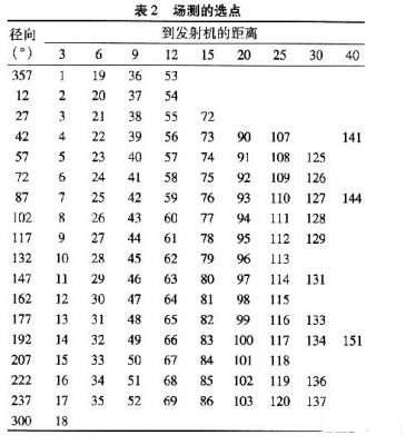 覆蓋測試是根據(jù)特定的半徑和幅角在圓周上進(jìn)行選點(diǎn)的,這些測試點(diǎn)的選擇總共包含18個(gè)不同幅角(12,27,42,58,72,87,102,117,132,147,162,177,182,207,222,287,300,357),對(duì)應(yīng)于以發(fā)射機(jī)為圓心的3,6,9,12,15,20,25,30和40 km這幾個(gè)半徑上。選點(diǎn)是出于幅角的考慮,展現(xiàn)了至少45 dBμV/m內(nèi)的場強(qiáng)估計(jì),并根據(jù)地形信息通過算法得到有用信息。圖2展示了場測選點(diǎn)的地形分配,測試點(diǎn)的具體參數(shù),如表2所示。