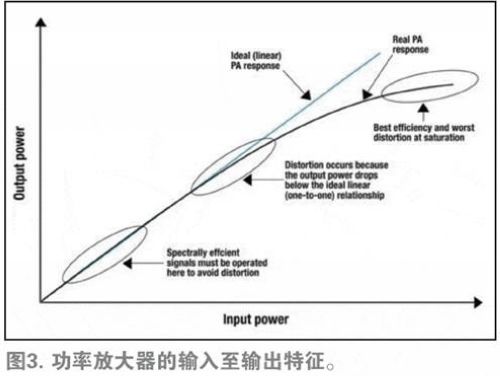 過去的無線標(biāo)準(zhǔn)使服務(wù)提供商在接近最大輸出功率下才運(yùn)行基站,從而實(shí)現(xiàn)最低的資本成本(覆蓋同一區(qū)域所需的基站更少),而且運(yùn)行成本也最低(電力成本更低)。但隨著無線用戶數(shù)量的爆炸式增長(zhǎng)以及通過基礎(chǔ)局端傳輸?shù)臄?shù)據(jù)量大幅增長(zhǎng),這一狀況發(fā)生了改變,原因是還有PA第三個(gè)特性的存在:失真隨著輸出功率的增加而相應(yīng)增加,而當(dāng)PA開始與理想(線性)曲線背離時(shí),失真變得異常突出。