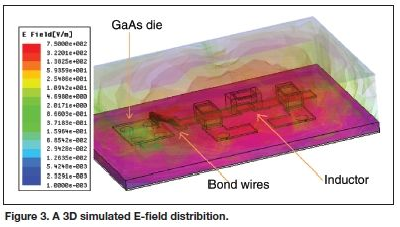 第二個關(guān)注的地方是微帶線附近的場線,在靠近地平面的地方它們最強。只要屏蔽和地平面間的距離明顯大于微帶線和地平面間的距離,則增加的屏蔽的效用就微乎其微。線綁定和表貼電感與地平面的直接耦合要弱些,當施加屏蔽時,預期其場線會有變化。圖3顯示的是3D模擬的E場分布。