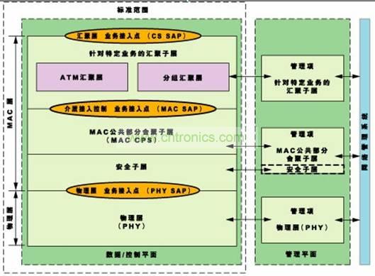 802.16 MAC協(xié)議是專門針對P2MP無線接入環(huán)境而設(shè)計(jì)的,可以支持諸如ATM、以太網(wǎng)和互聯(lián)網(wǎng)協(xié)議(IP)等傳輸協(xié)議,并且可以通過特定的匯聚層(如圖1所 示),適應(yīng)未來的技術(shù)發(fā)展。MAC層還可以利用物理層來實(shí)現(xiàn)很高的數(shù)據(jù)吞吐量,同時(shí)提供符合ATM標(biāo)準(zhǔn)的服務(wù)質(zhì)量(QoS),如UGS、rtPS、 nrtPS和盡高帶寬(BE)(如圖2所示)。