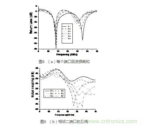 圖6給出了該相控陣前六個(gè)激勵(lì)端口的仿真回波損耗和和前七個(gè)天線的相鄰單元的耦合系數(shù)曲線。可以看出,各個(gè)端口匹配良好,且互耦隨著間隔的增大而較小。