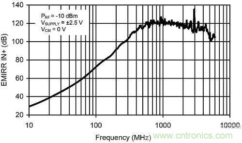 EMIRR曲線展示了運放被傳導的抗RF信號(該信號被應用到非反相輸入端)干擾能力的測定值。術(shù)語“被傳導”是指該RF信號被直接應用到使用阻抗匹配型印刷電路板(PCB)的運放輸入端。此外,還對放大器輸入端的反射進行了表征和說明。