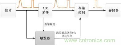這就要靠觸發(fā)系統(tǒng)來實(shí)現(xiàn)。觸發(fā)的原理是一直監(jiān)控信號(hào)流,若發(fā)現(xiàn)信號(hào)滿足設(shè)定的觸發(fā)條件,觸發(fā)器記錄滿足條件的信號(hào),啟動(dòng)采樣;待數(shù)據(jù)采集完畢后,由控制器對(duì)信號(hào)進(jìn)行處理和顯示。具體如下圖1所示。