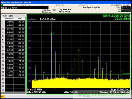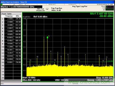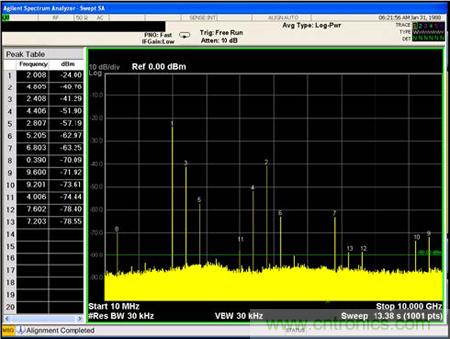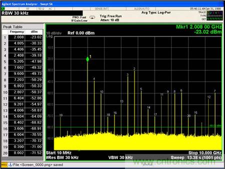 依照圖7所示測試電路,將測試3種不同狀態(tài)下從混頻器反射到源端的信號頻譜:
