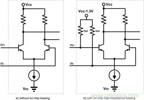 PECL 的輸入是一個(gè)具有高輸入阻抗的差分對(duì),該差分對(duì)的共模電壓需要偏置到VBB =VCC-1.3V,這樣允許的輸入信號(hào)電平動(dòng)態(tài)最大。對(duì)于不同芯片的輸入級(jí),信號(hào)允許的共模電平可能會(huì)有些差異,請(qǐng)參考相應(yīng)的datasheet。有部分芯片在內(nèi)部已經(jīng)集成了偏置電路,使用時(shí)直接連接即可,有的芯片沒(méi)有加,使用時(shí)需要在芯片外部加直流偏置。