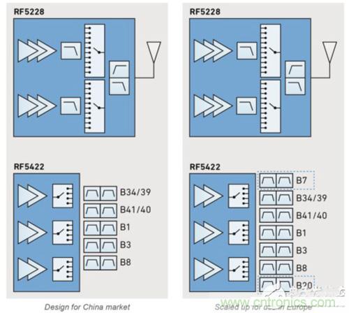 場景 1 制造商設(shè)計(jì)了一款采用 RF5422 多頻段 PA 模塊和 RF5228 高級(jí)發(fā)送模塊的中端手機(jī)。RF5422 提供所有必要的 3G 和 4G PA 功能;RF5228 為所有頻段提供 2G 支持和天線開關(guān)功能。針對中國市場,制造商添加了濾波器以支持 1、3、8、34、39、40 和 41 頻段。通過簡單添加頻段 7 和 20 的濾波器,即可針對歐洲的使用來對相同設(shè)計(jì)進(jìn)行擴(kuò)展。制造商可以在兩個(gè)區(qū)域使用相同的 PCB 設(shè)計(jì),并根據(jù)需要在 PCB 中添加濾波器。