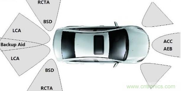 應(yīng)用于汽車的防撞雷達(dá)一般工作在兩個頻段:24GHz-24.25GHz和76GHz-81GHz;工作在24GHz頻段的防撞雷達(dá)一般安裝在汽車后向,實現(xiàn)盲區(qū)監(jiān)測(BSD),變道輔助(LCA)以及倒車側(cè)向警告(RCTA)等功能;工作在76GHz-81GHz頻段的毫米波防撞雷達(dá)一般安裝在汽車前向,用于實現(xiàn)自適應(yīng)巡航(ACC),緊急制動(AEB)等功能。汽車防撞雷達(dá)不同功能覆蓋區(qū)域如圖1所示: