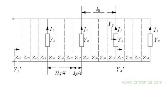 該串饋網(wǎng)絡(luò)依靠阻抗變換段實現(xiàn)波束賦形的激勵幅度,通過改變輸出饋線的長度實現(xiàn)波束賦形的激勵相位;串饋網(wǎng)絡(luò)等效電路如圖9所示