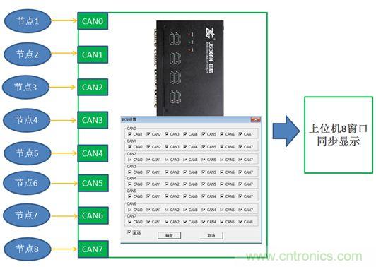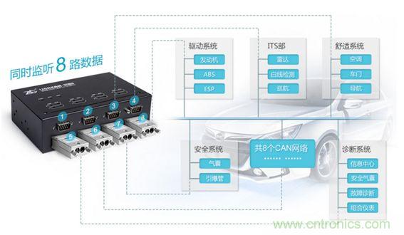 若將每個節(jié)點單獨取出做測試,則必然破壞原有通信規(guī)則。如何在不破壞原有通信的基礎上搞清楚一個陌生的收發(fā)協(xié)議呢?所謂工欲善其事,必先利其器。您需要一個能同時收發(fā)、轉送多路CAN數(shù)據(jù)的CAN卡,USBCAN-8E-U正是為這種應用而生。