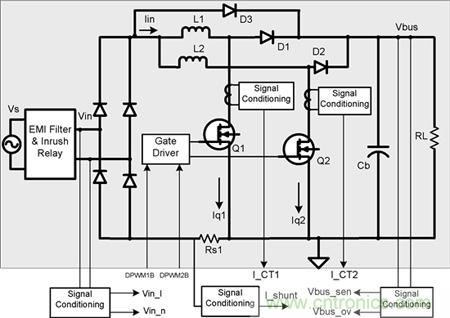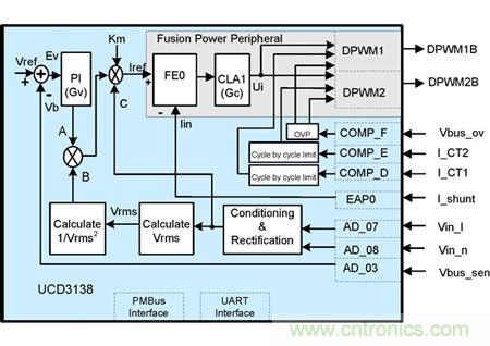 您可以看到固件外部仍有可使用示波器進行監(jiān)控的模擬信號。另外,您是否注意到方框底部輸出的信號?這些信號將進入 UCD3138 數(shù)字控制器并由固件處理,請看下圖。
