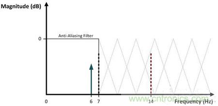 大多數(shù)ADC之前都會(huì)有一個(gè)抗混疊濾波器,而這個(gè)濾波器與衰減信號(hào)(超過(guò)了所需帶寬)的低通濾波器沒(méi)有什么不同。如圖4所示,一個(gè)理想抗混疊濾波器的響應(yīng)在那奎斯特頻率之前是絕對(duì)水平的,在這個(gè)頻率之后,它迅速滾降,以衰減帶外頻率。在這里,采樣率已加倍至14SPS,這將7Hz的那奎斯特頻率和原始6Hz輸入安全的放置在通頻帶之內(nèi)。