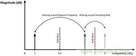 不過(guò),你怎么能知道6Hz正弦波將會(huì)在1Hz和8Hz時(shí)出現(xiàn)混疊呢?在頻率域內(nèi)觀察混疊會(huì)使得這一點(diǎn)變得很明顯。當(dāng)使用ADC進(jìn)行采樣時(shí),輸入信號(hào)的頻率成分,從DC開(kāi)始,在數(shù)倍于采樣率的頻率上重現(xiàn)?,F(xiàn)在,你應(yīng)該明白術(shù)語(yǔ)“折返”為什么經(jīng)常被用來(lái)描述信號(hào)的混疊方式了—如果你沿著虛線將圖3折疊起來(lái)看,這些信號(hào)互相之間完美地重疊在一起。