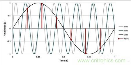 為了準(zhǔn)確地測(cè)量輸入正弦波,采樣率必須滿足那奎斯特采樣標(biāo)準(zhǔn)。在上面的示例中,你需要將采樣率至少增加到12SPS。恰恰在12SPS時(shí),6Hz輸入將仍然折返至DC,并且會(huì)在測(cè)量值中增加一個(gè)偏移,所以,采樣只快了一點(diǎn)點(diǎn),確保你所需要的信號(hào)根本就不會(huì)發(fā)生混疊。