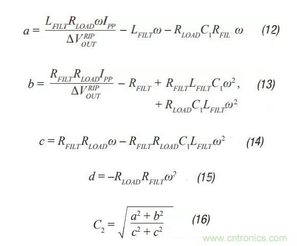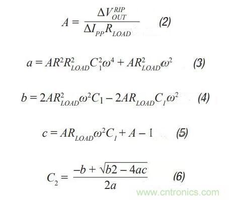 第3步:C2隨后可通過(guò)公式2至公式6計(jì)算得出。A、a、b和c是簡(jiǎn)化計(jì)算的中間值,沒(méi)有實(shí)際意義。這些公式假定R < />LOAD,且每個(gè)電容的ESR較小。這些都是很好的假設(shè),引入的誤差很小。C2應(yīng)等于或大于C1??烧{(diào)節(jié)第1步中的紋波,使其成為可能。
