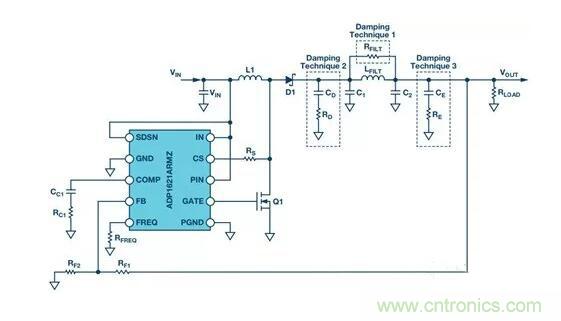 圖4. 采用輸出濾波器并突出多種不同阻尼技術(shù)的ADP1621
