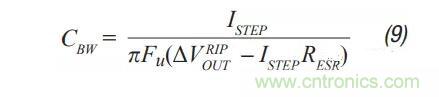 第3步:如前所述,添加濾波器會(huì)影響轉(zhuǎn)換器補(bǔ)償,具體表現(xiàn)為降低可實(shí)現(xiàn)的交越頻率(Fu)。根據(jù)公式7的計(jì)算,對(duì)于電流模式轉(zhuǎn)換而言,可實(shí)現(xiàn)的最大Fu是開(kāi)關(guān)頻率的1/10以下,或者是濾波器FRES的1/5以下。幸運(yùn)的是,大部分模擬負(fù)載不需要太高的瞬態(tài)響應(yīng)。公式9計(jì)算轉(zhuǎn)換器輸出所需的輸出電容近似值(CBW),以提供指定的瞬態(tài)電流階躍。