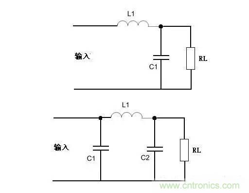 根據電抗性元件對交、直流阻抗的不同,由電容C及電感L所組成的濾波電路的基本形式如圖1所示。因為電容器C對直流開路,對交流阻抗小,所以C并聯在負載兩端。電感器L對直流阻抗小,對交流阻抗大,因此L應與負載串聯。