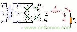在橋式整流電路中,當u2正半周時,D1、D3導電,電感中的電流將滯后u2不到90°。當u2超過90°后開始下降,電感上的反電勢有助于D1、D3繼續(xù)導電。當u2處于負半周時,D2、D4導電,變壓器副邊電壓全部加到D1、D3兩端,致使D1、D3反偏而截止,此時,電感中的電流將經由D2、D4提供。由于橋式電路的對稱性和電感中電流的連續(xù)性,四個二極管D1、D3;D2、D4的導電角θ都是180°,這一點與電容濾波電路不同。